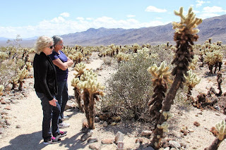 Today was a cloudy day in the desert - there was one cloud. At home this is a sunny day. The plan was to take an hour long trip to the entrance of Joshua Tree National Park. This is a natural desert environment park. The first section of the park that we stopped at was the Cholla Garden featuring the teddy bear cacti.