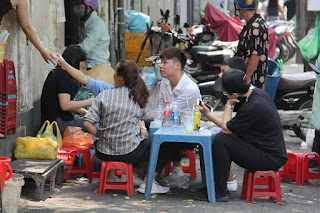 Because of space constraints and the weather, alot happens on the narrow sidewalks, everything from shoe repair, to scooter repair, to restaurants, to hairdressing, to....you name it.